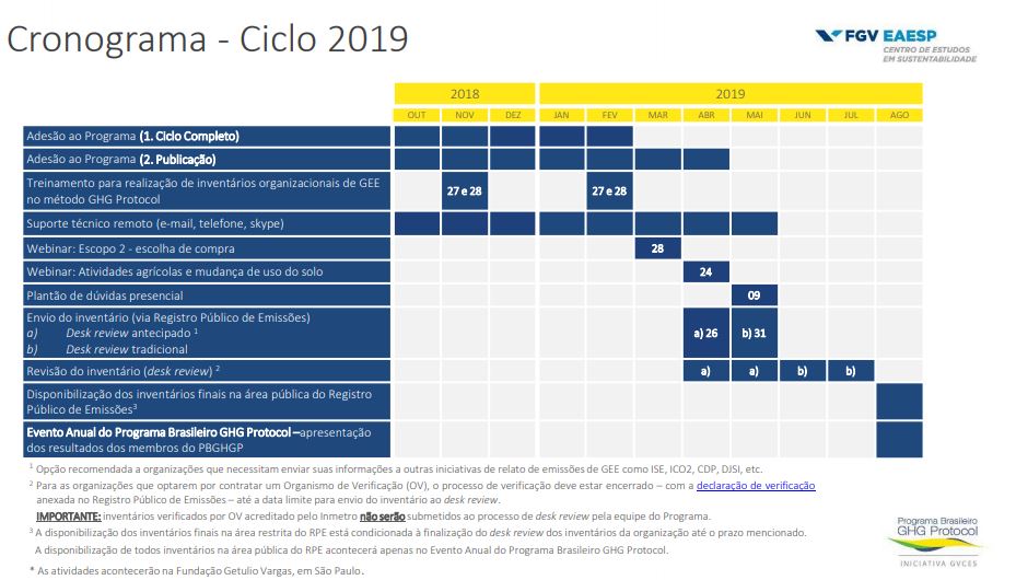 Para o ciclo 2019, o Programa já divulgou seu cronograma. O prazo para adesão para publicação do inventário de GEE no Registro Público de Emissões vai até abril.