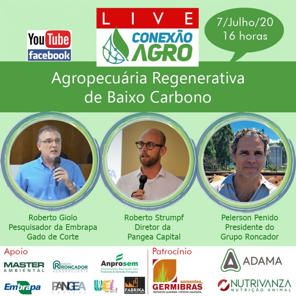 O Portal Conexão Agro realiza live com a participação de debatedores de renome para falarem sobre sistemas produtivos verdes: Roberto Giolo, pesquisador da Embrapa Gado de Corte (MS), Roberto Strumpf, diretor da Pangea Capital, e Pelerson Penido o presidente do Grupo Roncador.